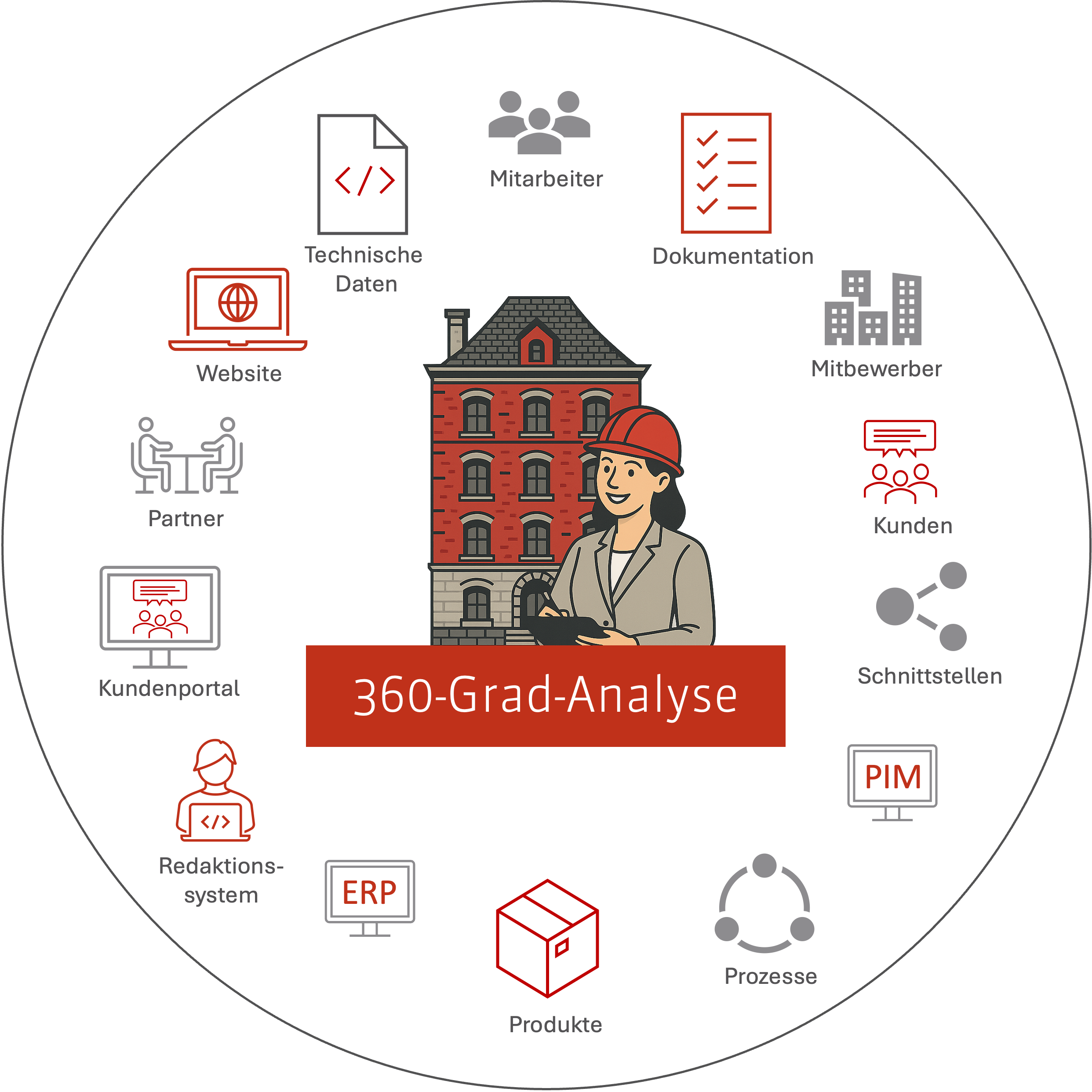 Hier kommt die 360-Grad-Analyse ins Spiel. Sie ist wie eine gründliche Gebäudeinspektion – nur eben für Inhalte, Prozesse und Datenflüsse. Statt nur einzelne Räume zu inspizieren, betrachten wir bei der 360-Grad-Analyse das ganze Haus: