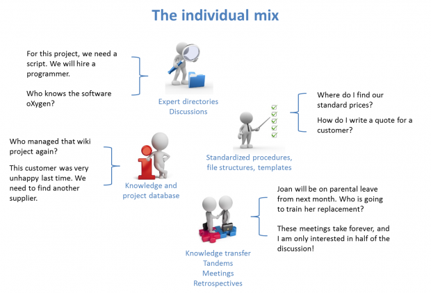 Which tool and methods you use for implementing knowledge management depends on your requirements, goals and – last, but not least – your staff. The tools and methods must fit your organization and your knowledge management strategy: codification or personalization.